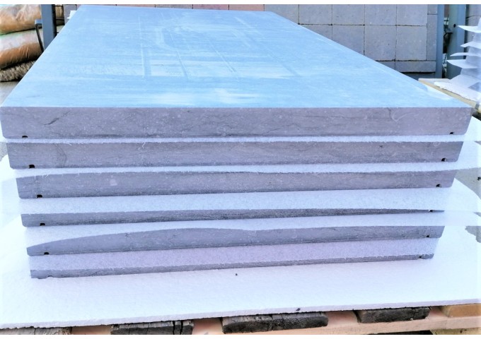 Dimensions:  Longueur= 100cm - Largeur= 35cm - Epaisseur=  4cm - Nombre par palette= 25pièces - Poids= 37.78kg/ pièce - Poids/ palette= 1250Kg/ palette - Pierre bleue belge de couvre mur-seuil scié et poncé avec 2 gouttes d'eau de 6x6mm situé à 30mm et assurant l'évacuation des eaux de pluie de vos murs et vos toitures plates - CAUTION PALETTE EURO