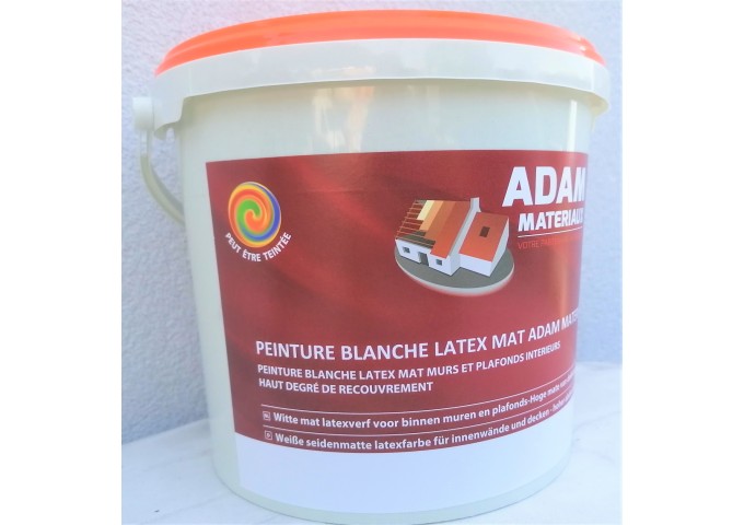 Consommation en 2 couches= 4 à 6m²/litre= 0.2 à 0.26Litres/m²= 20 à 30m²/seau 5 Litres - séchage=4Heures  - Application entre 5 et 25°C  - 72 seaux/palette  - Comme primer, diluez la peinture avec 50% d'eau - La peinture Adam Matériaux intérieure Latex Mate par seau de 5 Litres est une peinture pours MURS et PLAFONDS - La peinture forme une couche mate -  Elle est particulièrement recommandé pour les espaces de peinture tels que les cuisines, salles à mager, livings, chambres, salles de séjour, d'autres pièces, et les espaces de bureau  - A appliquer sur support de ciment, plaques de plâtre, plâtre, enduits à la chaux, des surface en béton, ... Fabricant= Adam Materiaux