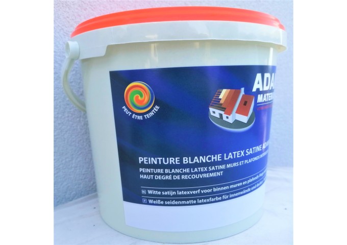 Consommation en 2 couches= 4 à 6m²/litre= 0.2 à 0.26Litres/m²=20 à 30m²/seau 5 Litres - séchage= 4Heures  - Application entre 5 et 25°C  - 72 seaux/palette  - Comme primer, diluez la peinture avec 50% d'eau - La peinture Adam Matériaux intérieure Latex Satine par seau de 5 Litres est une peinture pours MURS et PLAFONDS - La peinture forme une couche satiné -  Elle est particulièrement recommandé pour les espaces de peinture tels que les cuisines, salles à mager, livings, chambres, salles de séjour, d'autres pièces, et les espaces de bureau  - A appliquer sur support de ciment, plaques de plâtre, plâtre, enduits à la chaux, des surface en béton, ..Fabricant= Adam Materiaux
